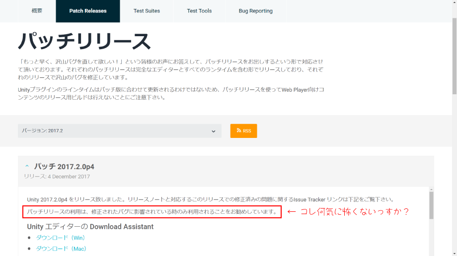 「パッチリリースの利用は、修正されたバグに影響されている時のみ利用されることをお勧めしています。」